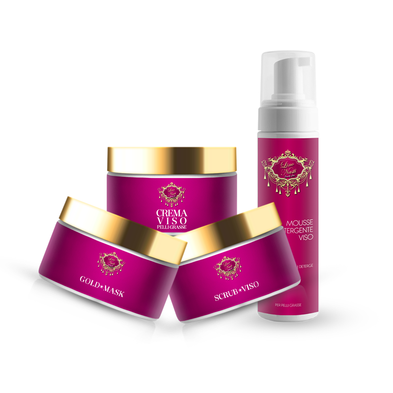 Kit viso è progettato appositamente per pelli grasse. Include uno scrub delicato per eliminare le impurità, una maschera al gold per ridurre l'untuosità, la nostra mousse detergente per detergere in profondità senza seccare, e una crema idratante leggera che controlla la produzione di sebo.